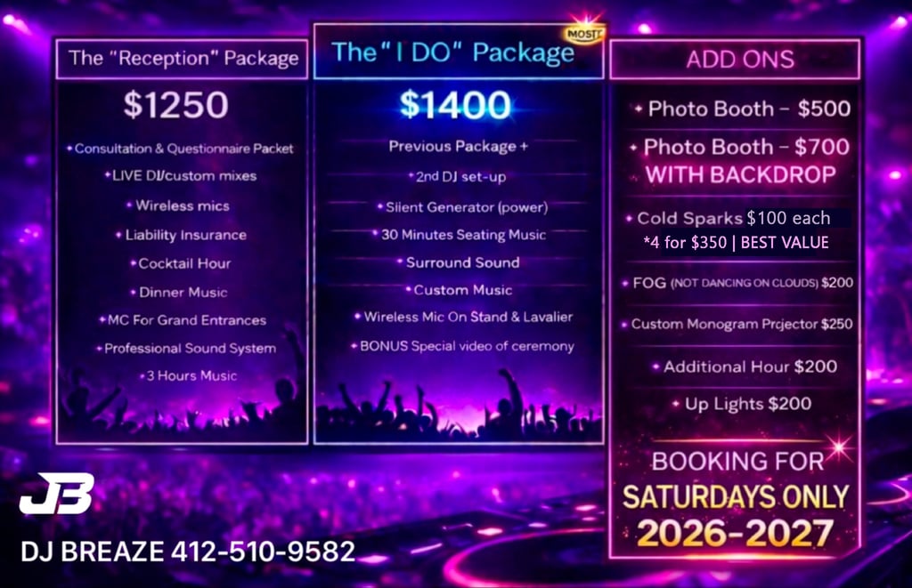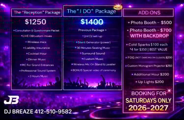 DJ Breaze brings the party to life with professional DJ services for weddings, reunions, parties, and events. Let us create unforgettable memories through quality music that gets everyone dancing!